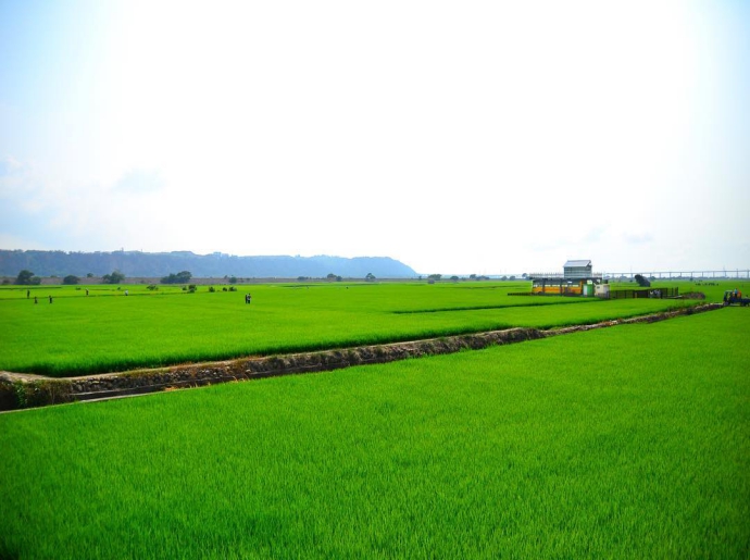 站在河堤上,居高臨下,觸目所及是由一塊塊錯落有致的田地,拼貼成夏綠秋黃的大地,真如孟浩然詩句「綠樹村邊合,青山郭外斜」的悠然意境。